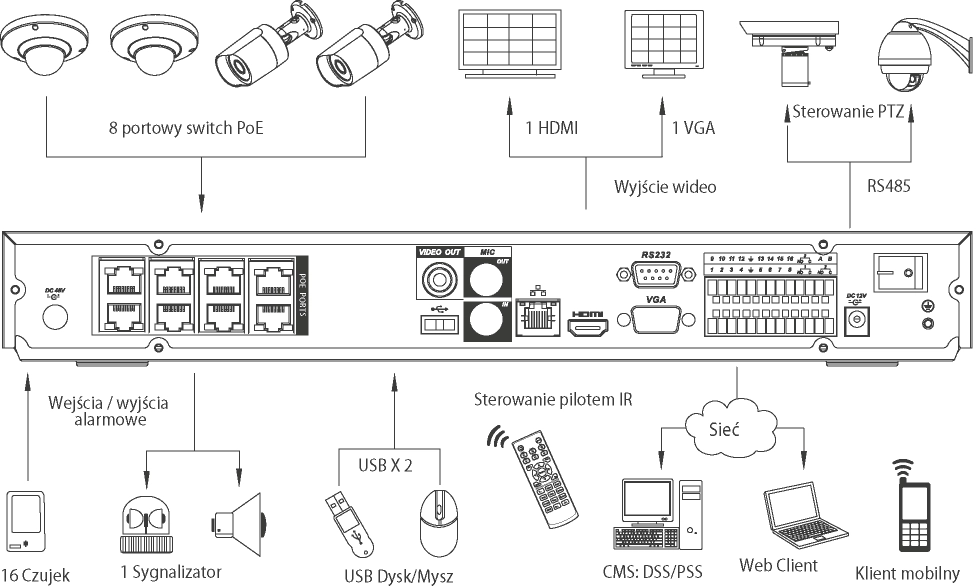 | VIDEO Wejścia Standard Wyjścia Przelotowe | 32 kan. IP do 5 Mpx PAL HDMI, VGA, USB 2.0 N/A |