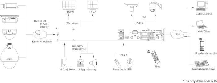 - Synchroniczne odtwarzanie max. do 16 kanałów do 1080p lub 4 kanałów przy rozdzielczości 3/5 Mpx