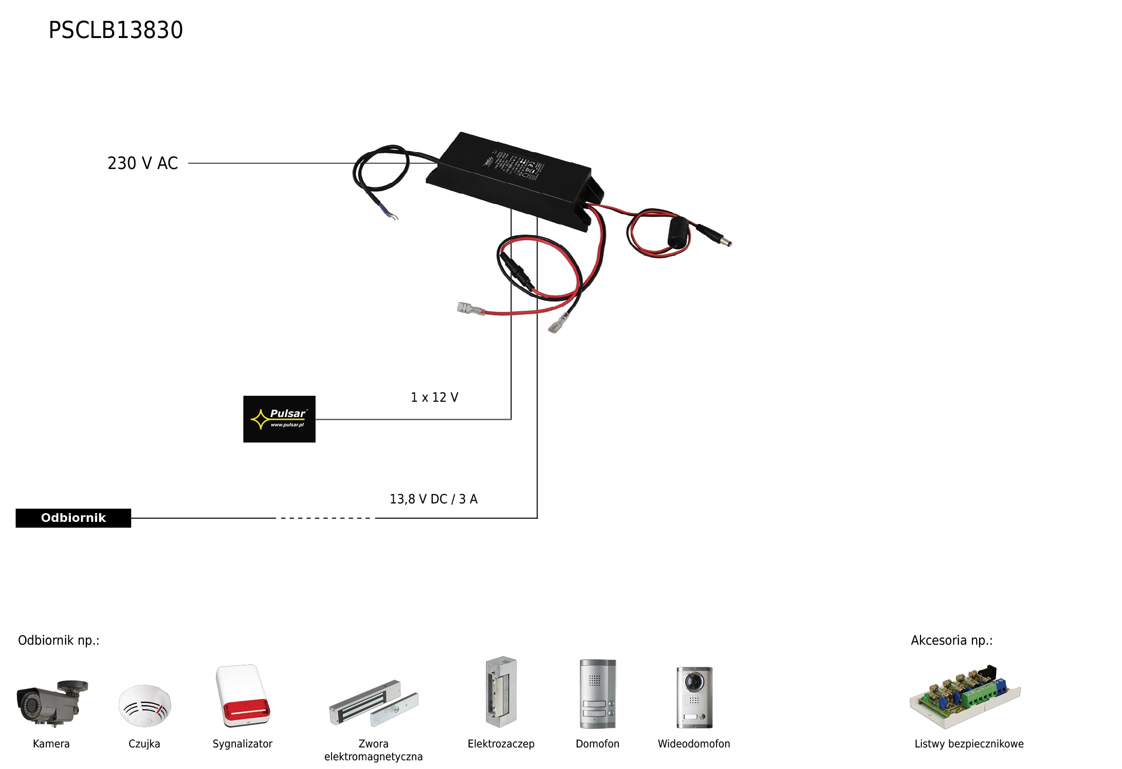 Zasilacz PSCLB13830 to wysoce sprawny (85%) zasilacz impulsowy, zaprojektowany do stabilnej pracy w systemach monitoringu, kontroli dostępu i alarmowych. Kluczową cechą jest jego sumaryczna moc wyjściowa wynosząca 45 W przy napięciu 13.8 V DC i prądzie 3.3 A. Urządzenie obsługuje szeroki zakres zasilania wejściowego 90–264 V AC i zapewnia niezbędne funkcje ochronne: SCP (zabezpieczenie przeciwzwarciowe), OLP (przeciążeniowe) oraz UVP (podnapięciowe), gwarantując bezpieczeństwo zarówno zasilacza, jak i podłączonych do niego urządzeń.